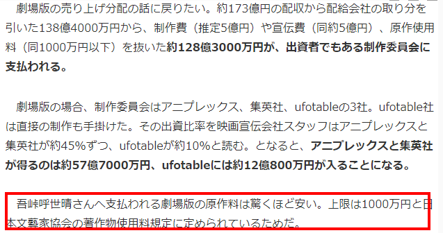 在173亿日元的票房当中,排除院线的分账后仍剩下138亿,再扣除制作费5亿和宣发费用5亿之后,剩下大约128亿日元。